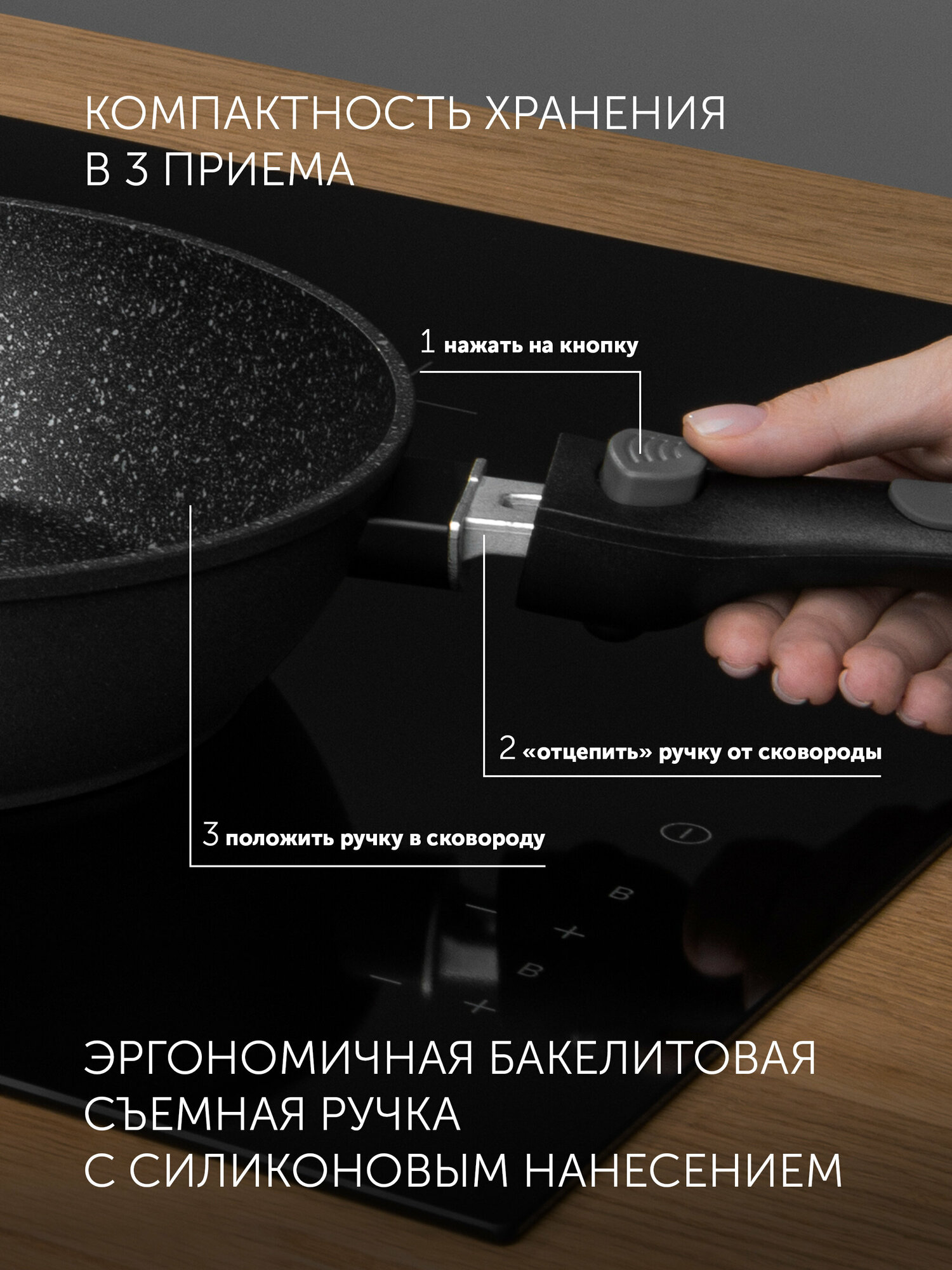 Сковорода Polaris Click&Keep 24F, 24см, съемная ручка, без крышки, черный [018796]