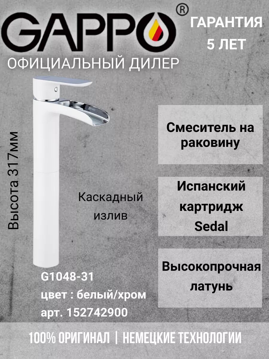 Смеситель для раковины 25к G1048-31 GAPPO высокий, каскадный излив, п/гайку, белый-хром