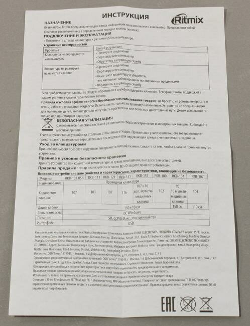 Клавиатура RITMIX RKB-141, USB, чёрная (1/20) 116 клавиш Системные требования: Windows 7, Vista, XP