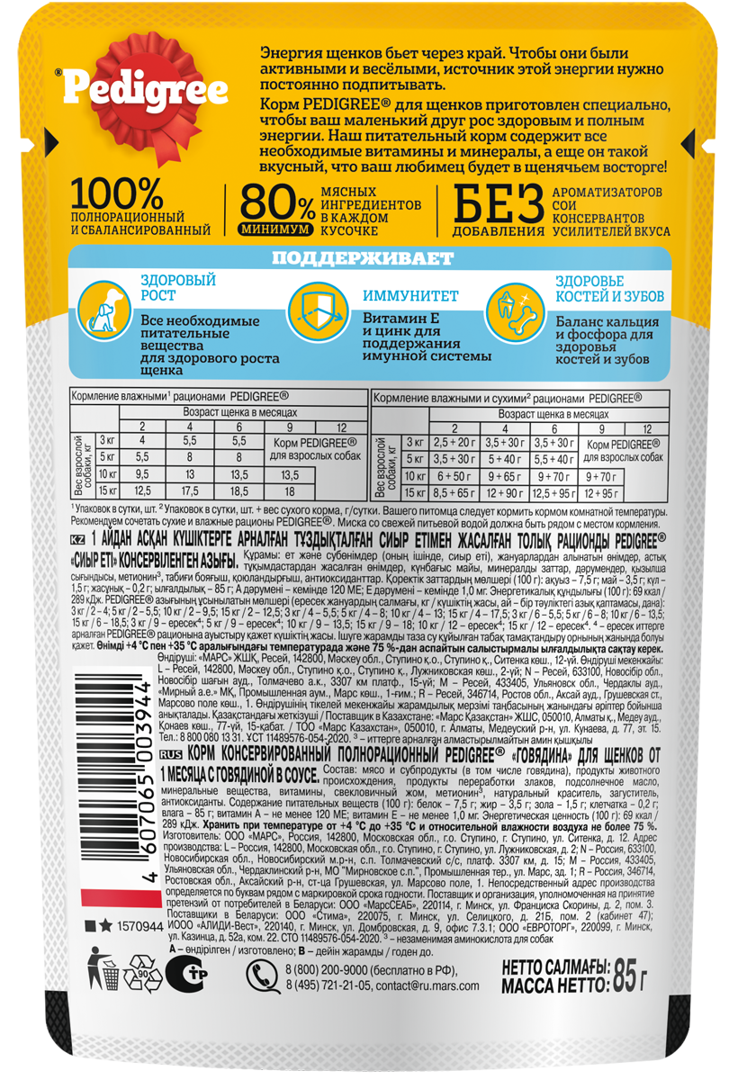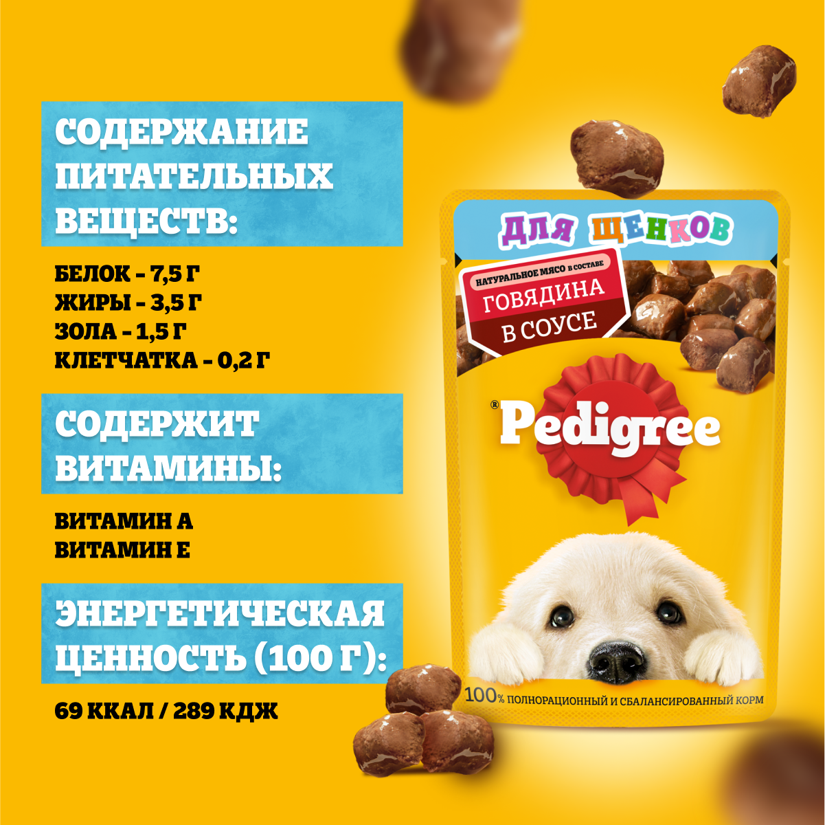 Корм консервированный для щенков PEDIGREE с говядиной в соусе, от 1 месяца, полнорационный, 85г, 24 шт.