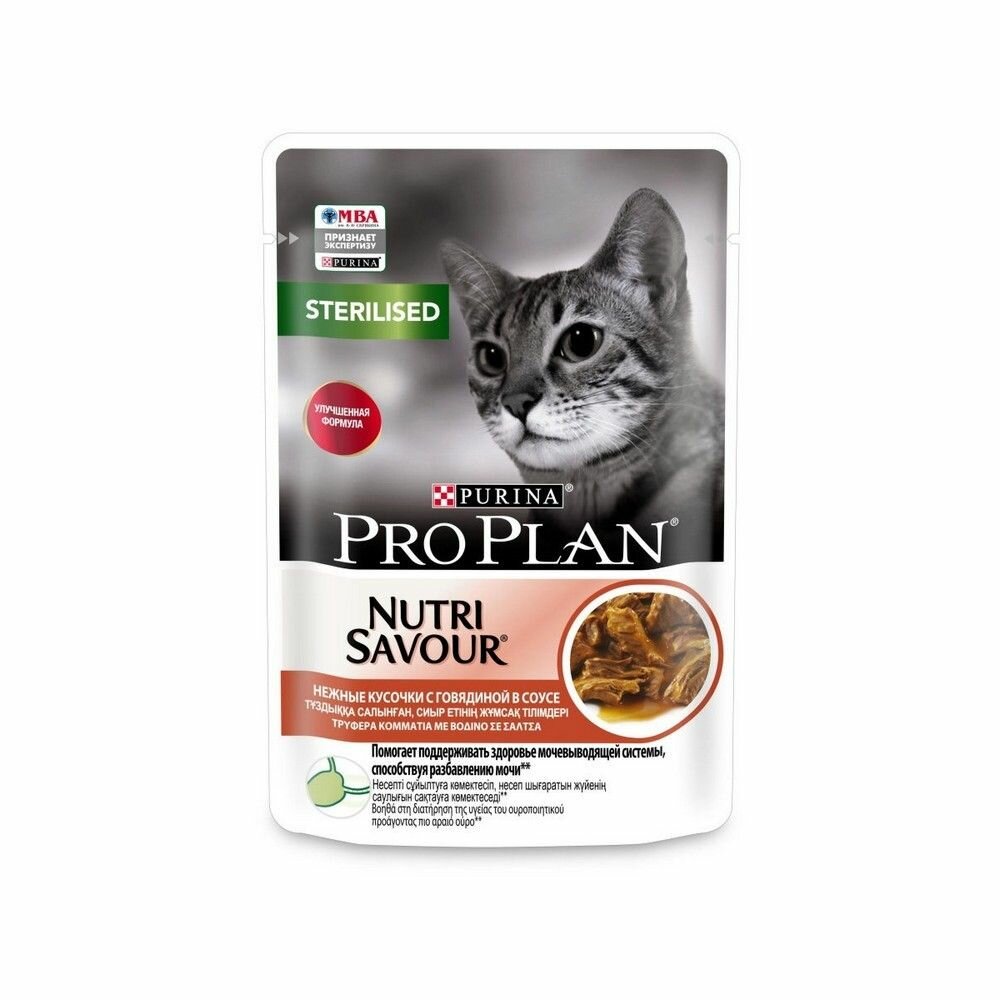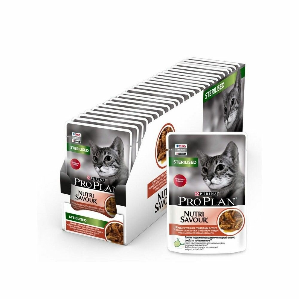 Pro Plan Nutrisavour Sterilised пауч для стерилизованных кошек и котов (кусочки в соусе) Говядина, 85 г. упаковка 26 шт