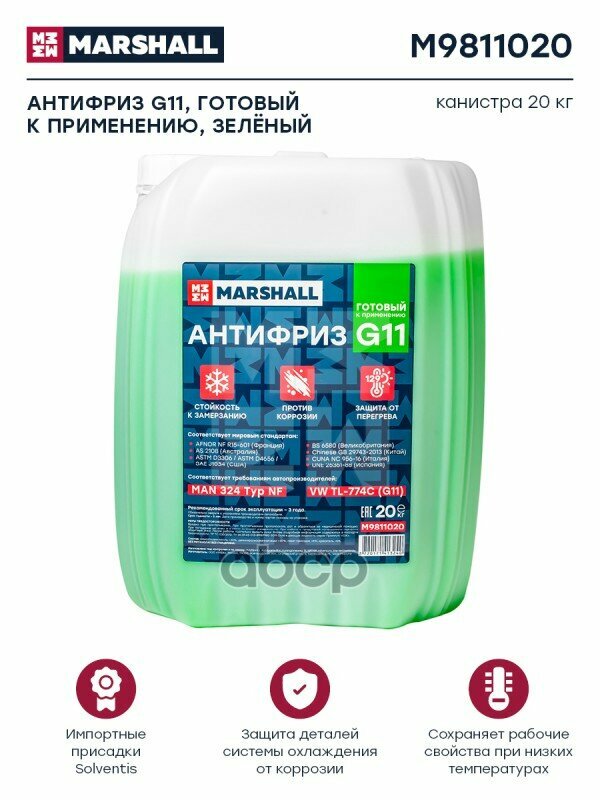 Антифриз Marshall G11, Готовый К Применению, Зеленый, Канистра 20 Кг. (M9811020) M9811020 MARSHALL арт. M9811020