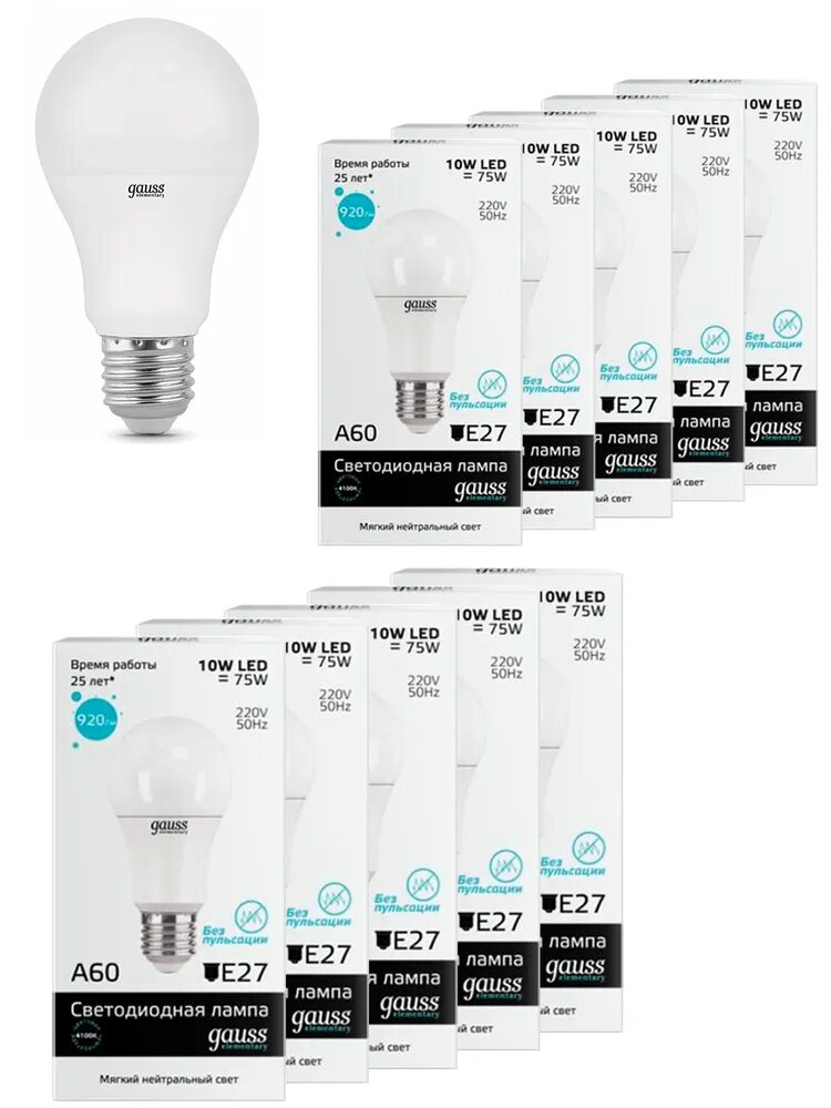 Лампа светодиод 10Вт груша А60 Е27 4100К 920Лм матовая Gauss Elementary интересное: