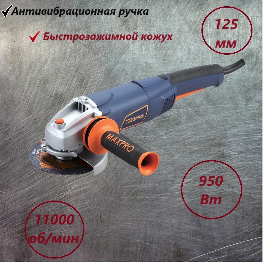 MAX-PRO Шлифмашина угловая 950 Вт; 11000об/мин; быстрозажимной кожух 125мм; длинная; антивибрационная ручка; 2,3 кг; кор.