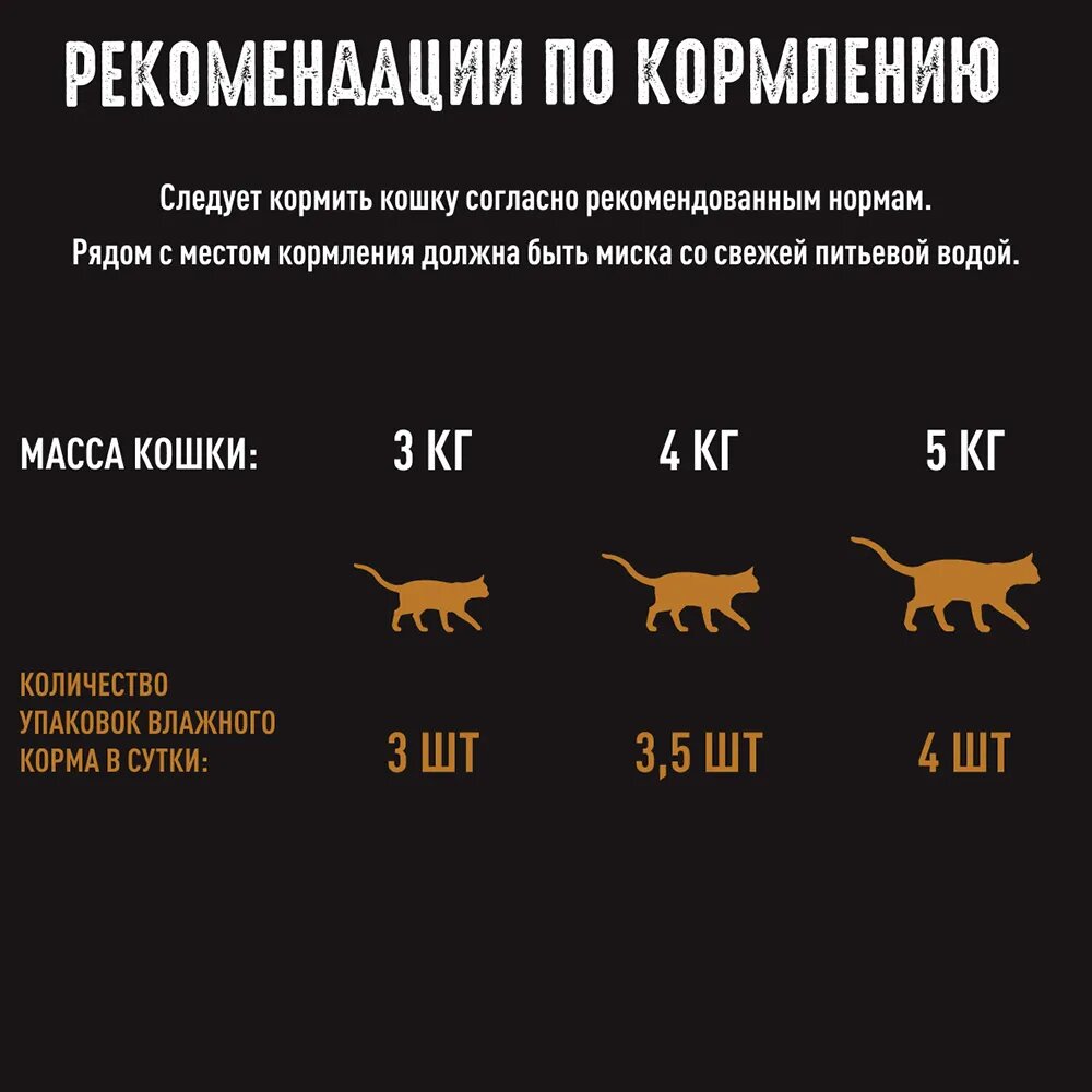 | Дозировка | при массе кошки 3 кг рекомендуемое количество упаковок влажного корма в сутки - 3 штуки, при массе кошки 4 кг - 3,5 штуки, при массе кошки 5 кг - 4 штуки. |