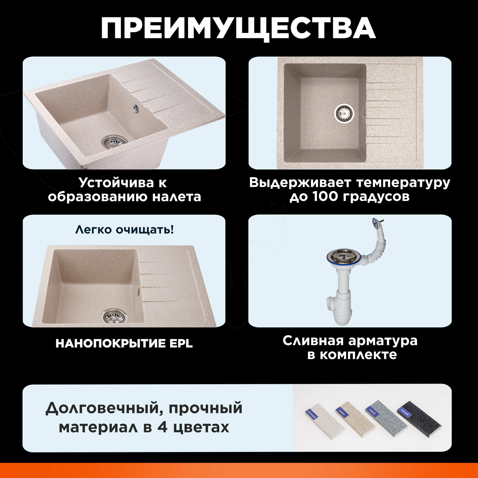 Мойка для кухни каменная AV ENGINEERING Unit 55х50, с сифоном (AVE550500BKA)