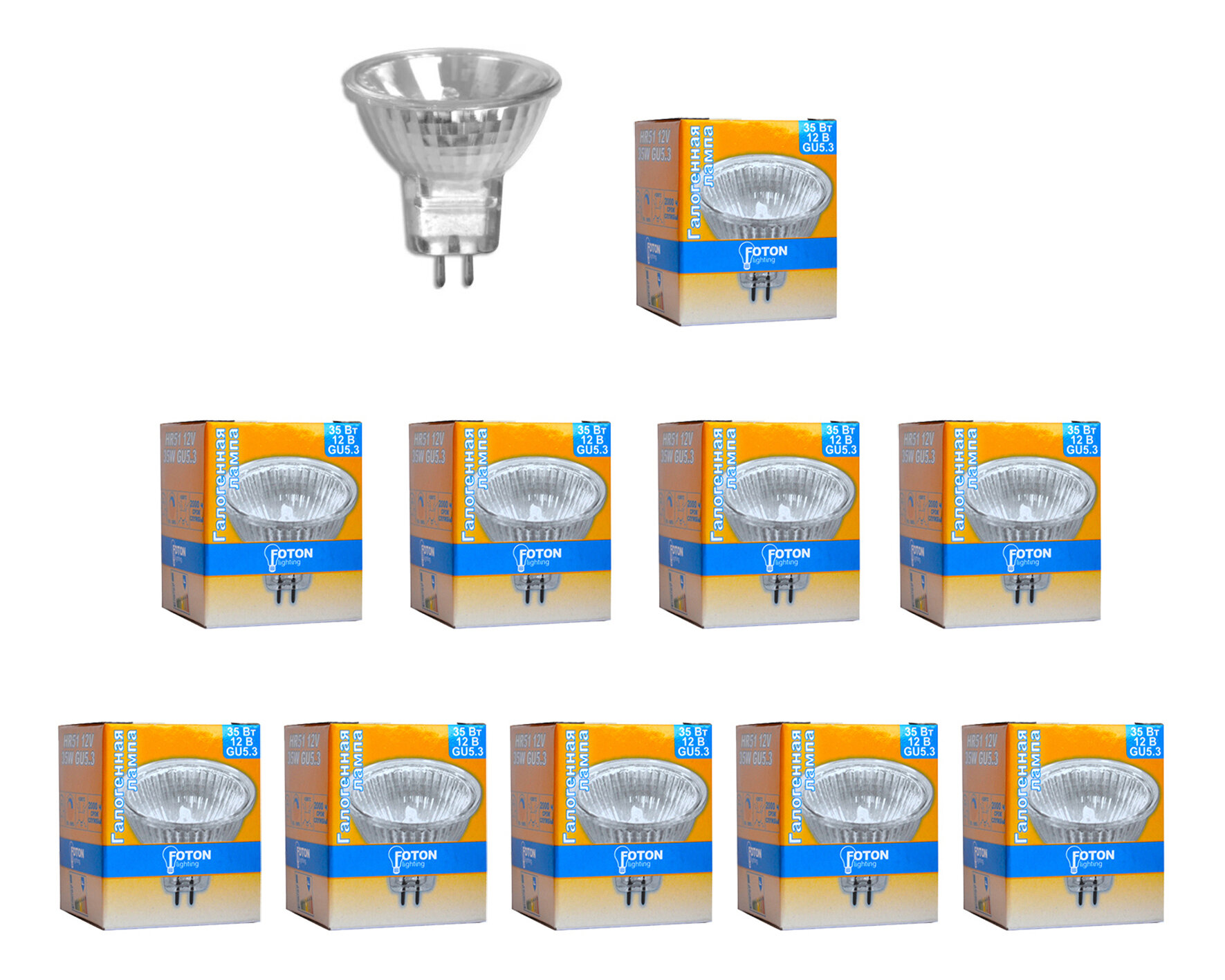 10шт/уп. Лампа Галогенная Софит 35Вт 12V GU5.3 MR16 3000К Угол 38 град. D-51mm L-45mm Диммируемая Свет Теплый белый Foton Lighting, уп. 10шт