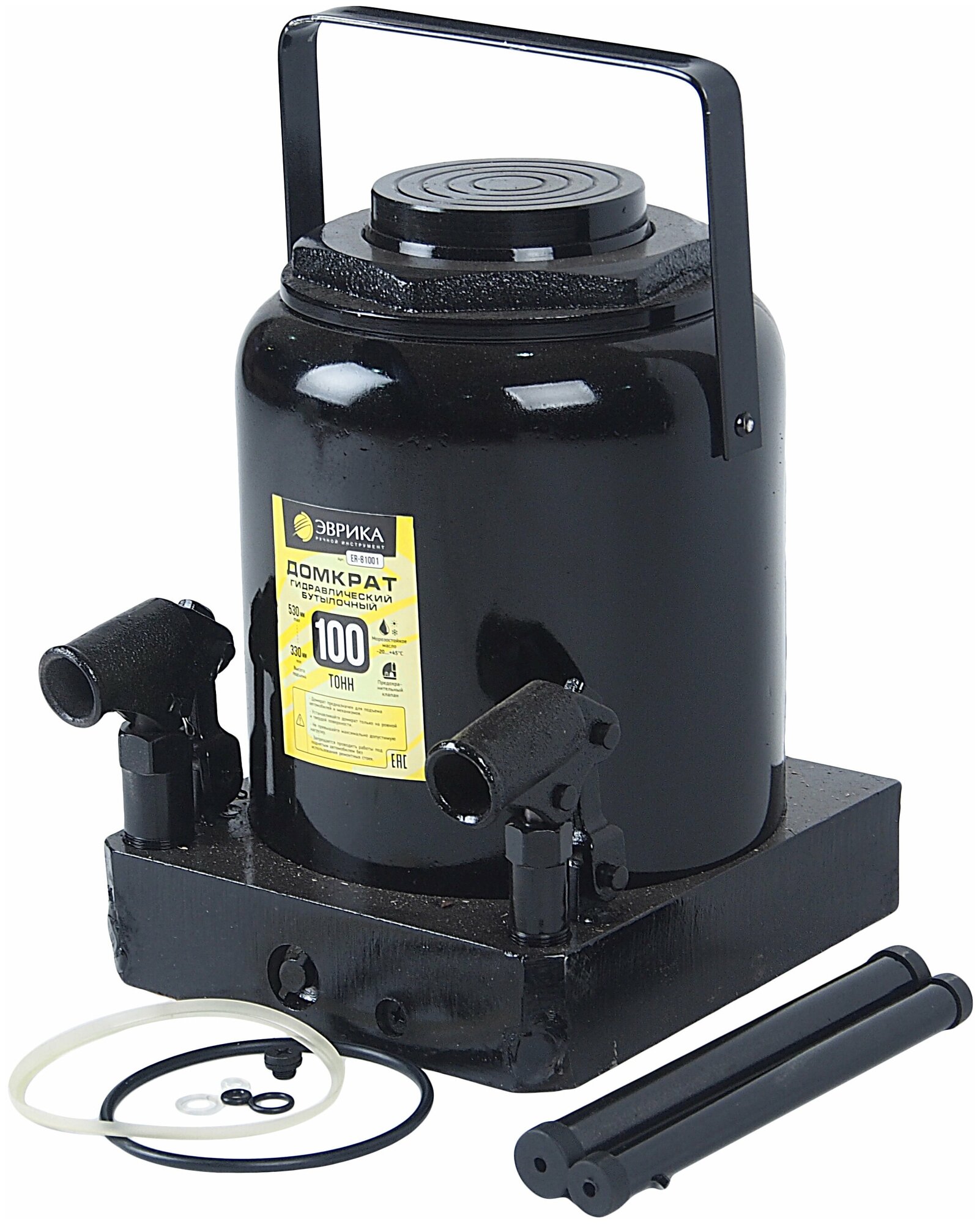 Домкрат гидравлический ER-81001 бутылочный с клапаном 100т, ремкомплект (выс. подъема 330-530мм) эврика