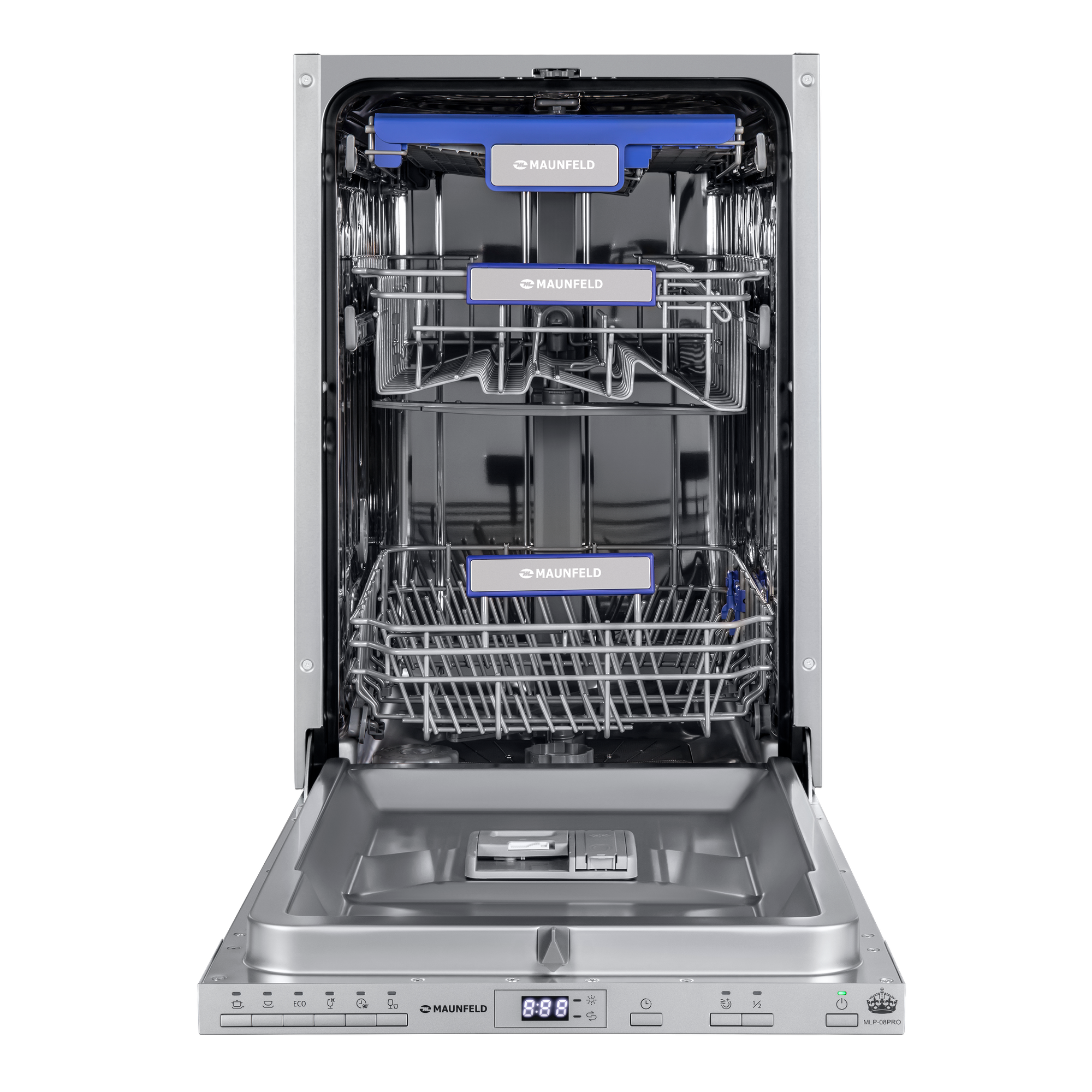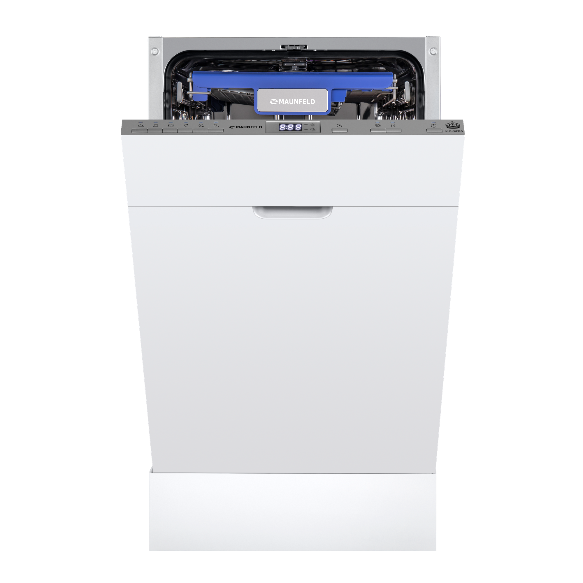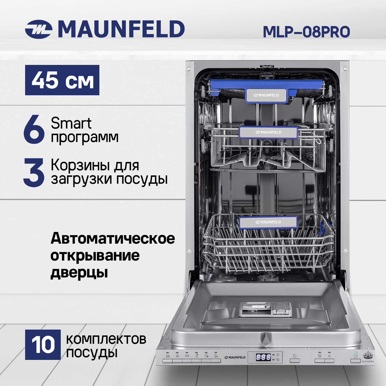 Посудомоечная машина MAUNFELD MLP-08PRO встраиваемая, узкая 45 см, 10 комплектов, 6 программ, 3 корзины, луч на полу, авто-открывание