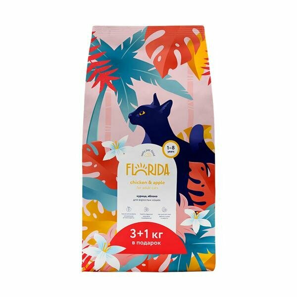 Сухой корм FLORIDA для взрослых кошек с курицей и яблоком, 3 кг+1 кг
