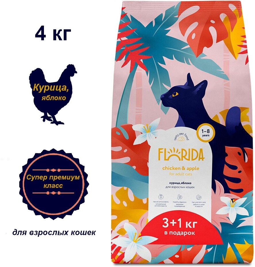 FLORIDA корм для взрослых кошек с курицей и яблоком 4 кг. х 1 шт.