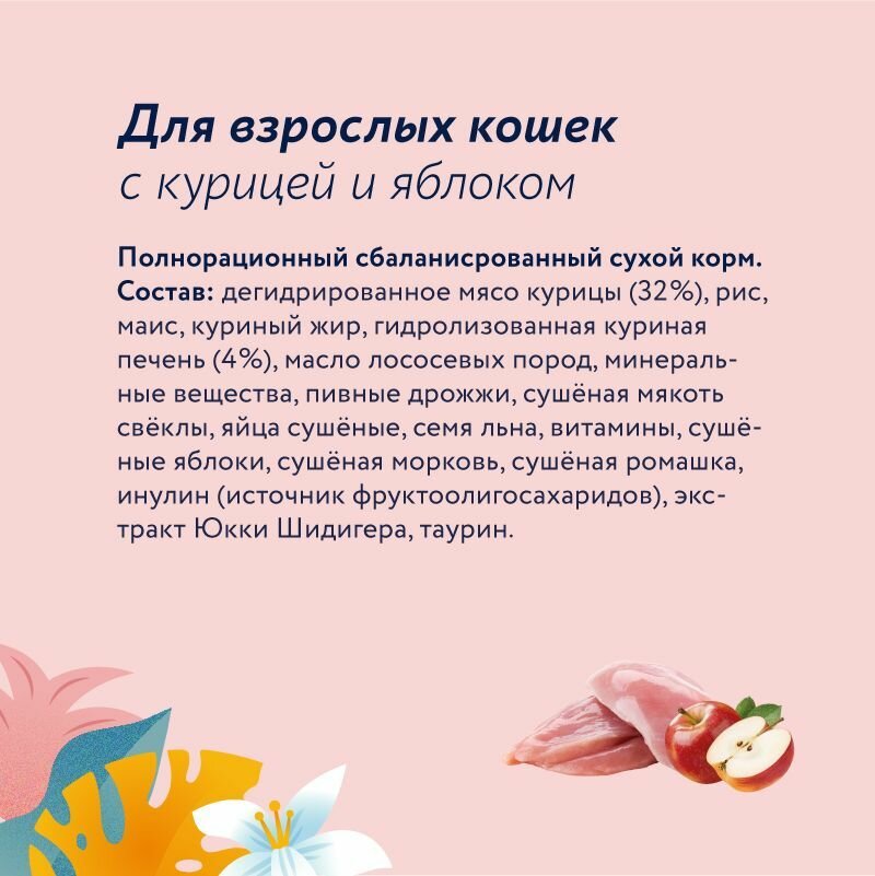 Сухой корм для взрослых кошек, с курицей и яблоком, 12 кг