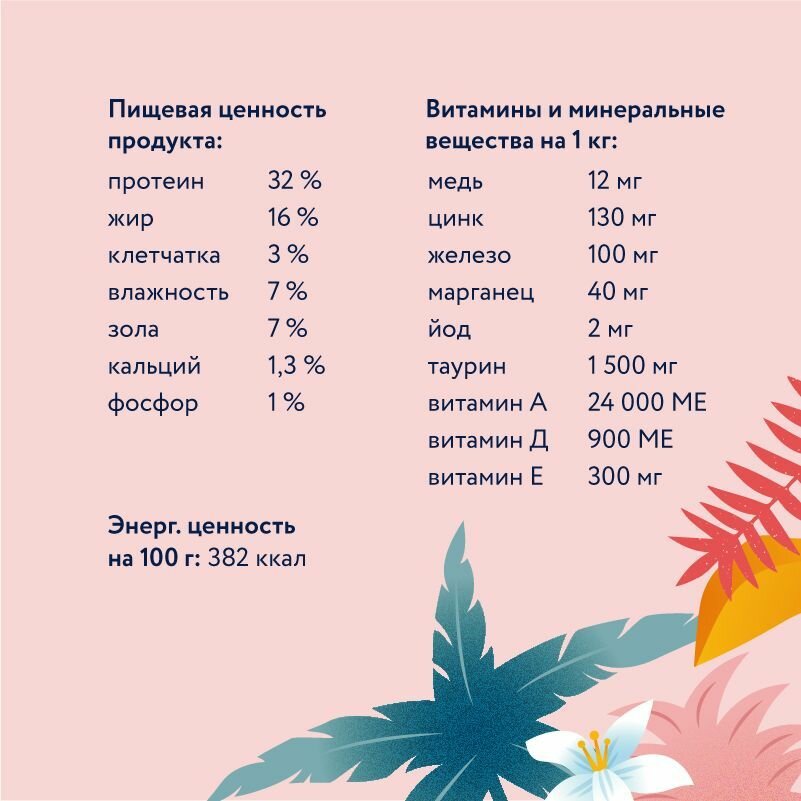 | Витамины | Витамин А 24000 МЕ/кг; Витамин Д 900 МЕ/кг; Витамин Е 300 мг/кг |