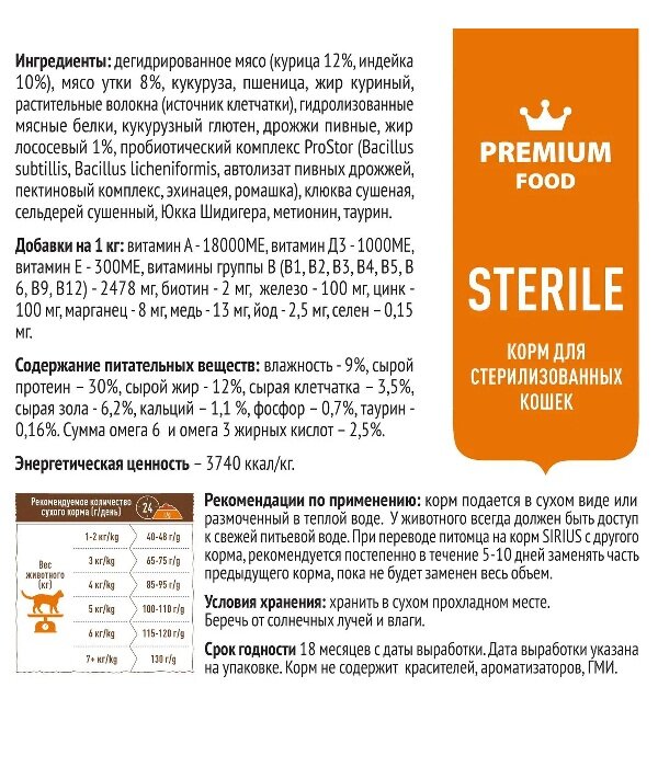 SIRIUS/Полнорационный сухой PREMIUM корм для стерилизованных кошек, Утка и клюква, 0.4 кг