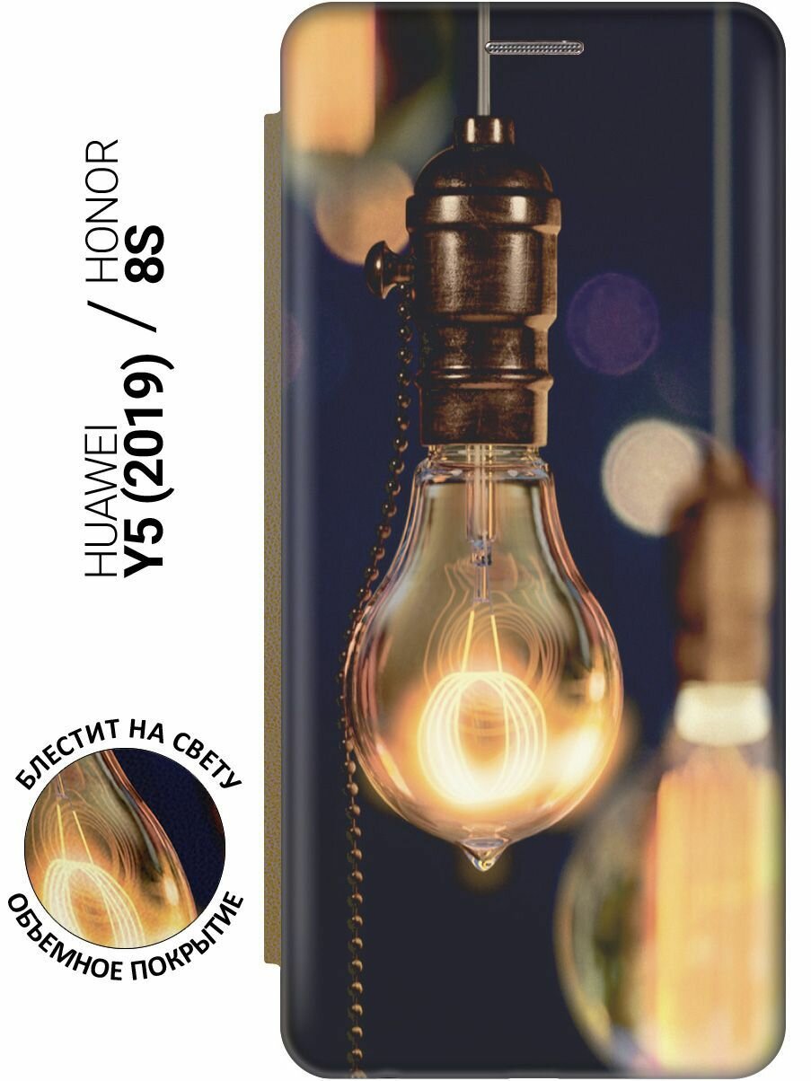 Чехол-книжка на Honor 8S / Huawei Y5 (2019) / Хуавей У5 2019 / Хонор 8с c принтом "Гирлянда в лампочке" золотистый