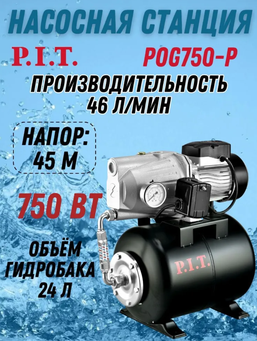 Станция насосная P.I.T. POG750-P, 750Вт, напор 45м, бак 24л, 46л/мин, чугун, для водоснабжения дома, дачи