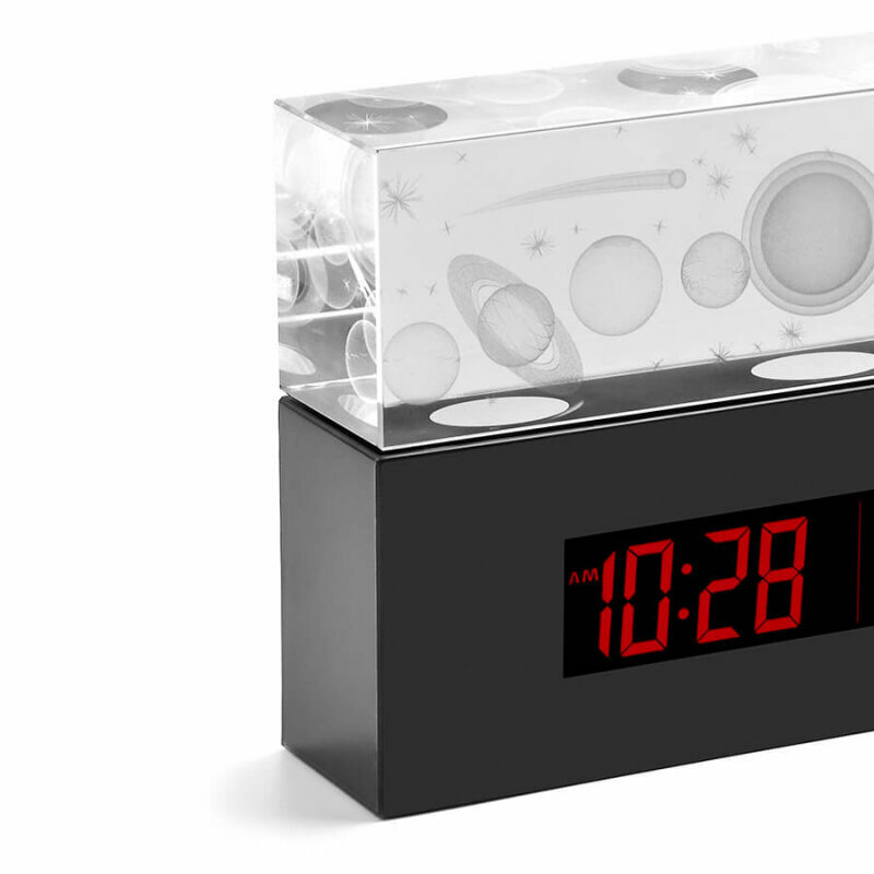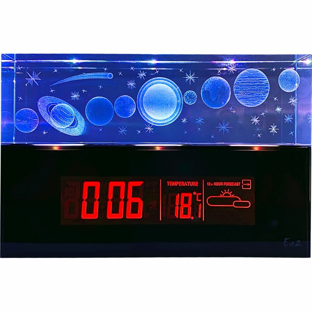 | Плюсы: | Стильная, красиво смотрится в темноте, прогноз погоды вроде работает адекватно. Можно выбрать цвет подсветки и яркость дисплея. |