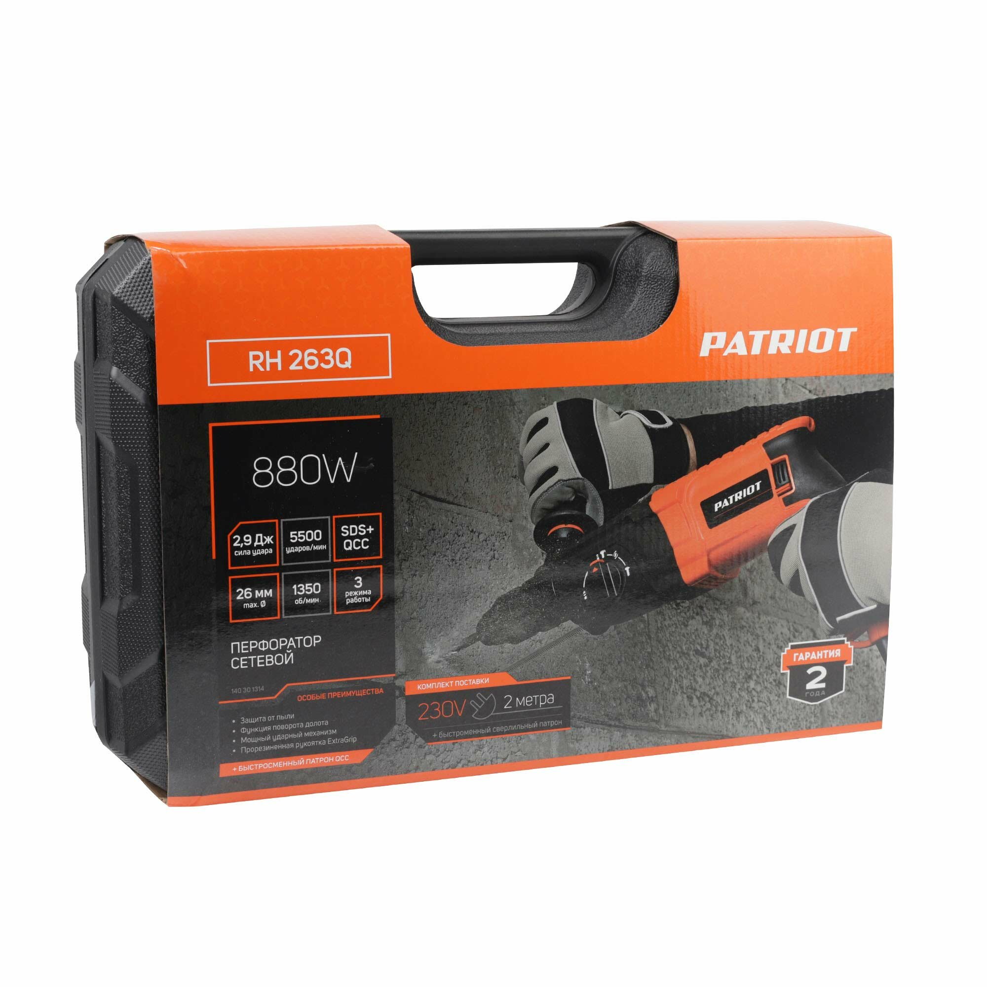 Перфоратор PATRIOT RH 263Q, SDS+, мощность 880 Вт, 2.9 Дж, 3 режима работы, быстросменный патрон QCC, макс.диаметр 26мм, глубиномер, кейс