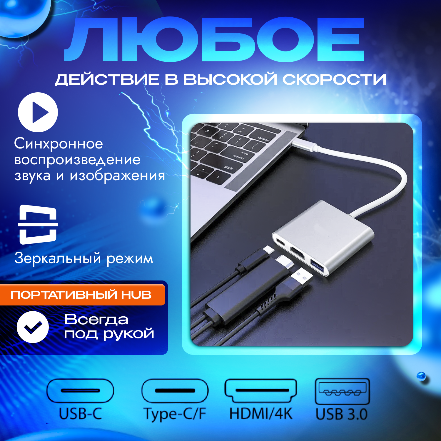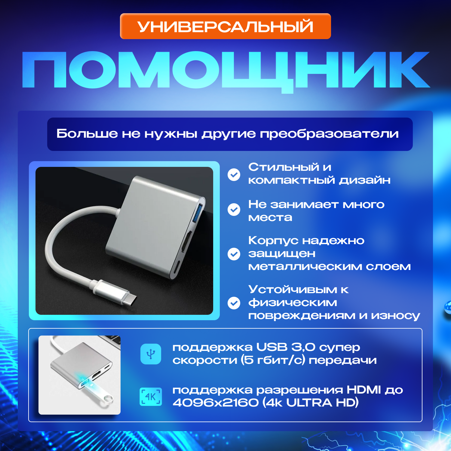 Купить USB Hub - 3-в-1 USB-конвертер с поддержкой разрешения 4К и защитой от перегрева