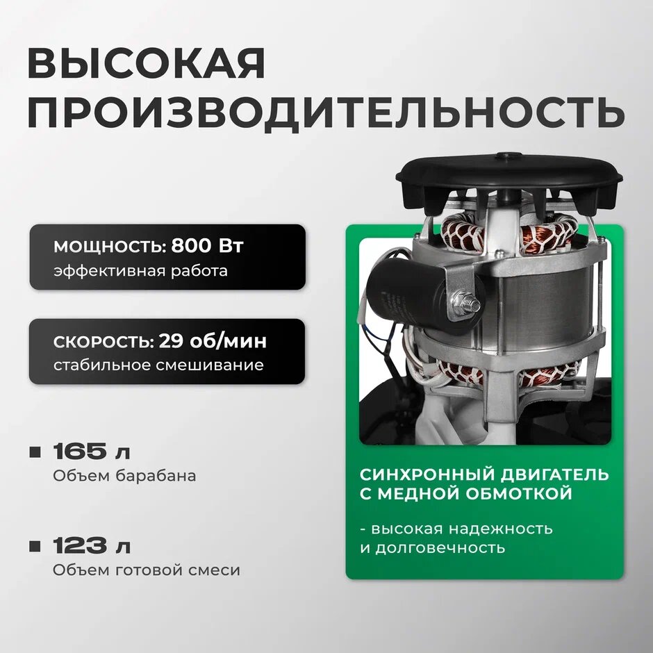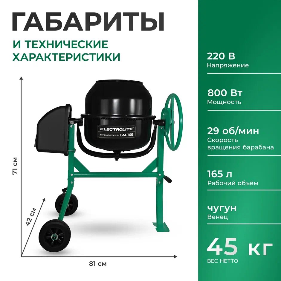 Бетоносмеситель строительный / Бетономешалка электрическая Electrolite БМ-165/EL (800 Вт, 165 л, чугунный венец) интересное: