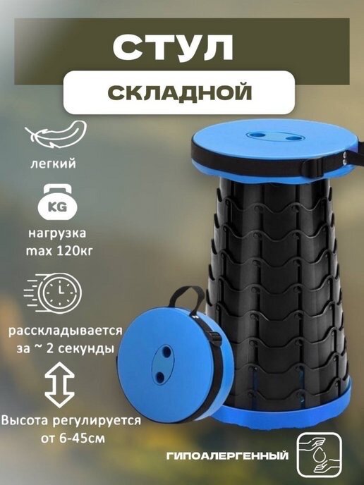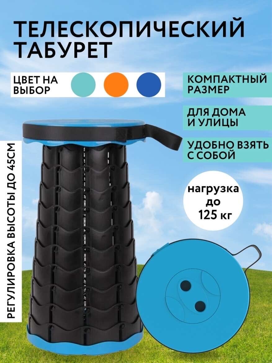 Табурет складной телескопический походный до 150 кг / Табурет складной для рыбалки / складной стул / синий
