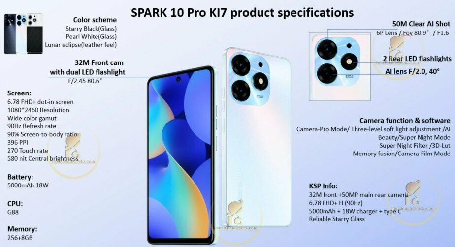Смартфон TECNO Spark 10 Pro 4/128 ГБ, RU, Dual nano SIM, pearl white