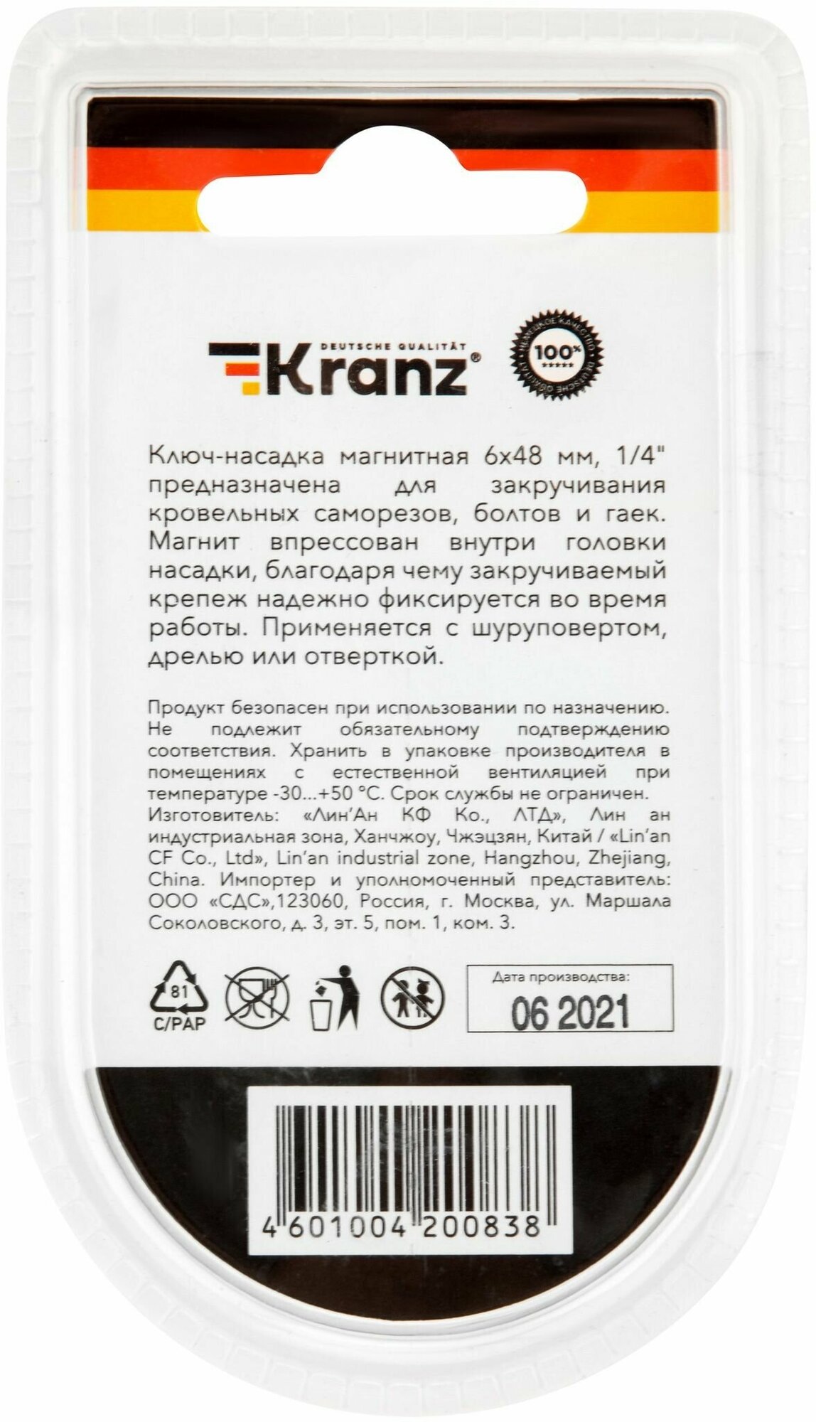 Ключ-насадка магнитная 1/4" 6х48 мм (2 шт./уп.) Kranz 1 упак арт. KR-92-0400-1