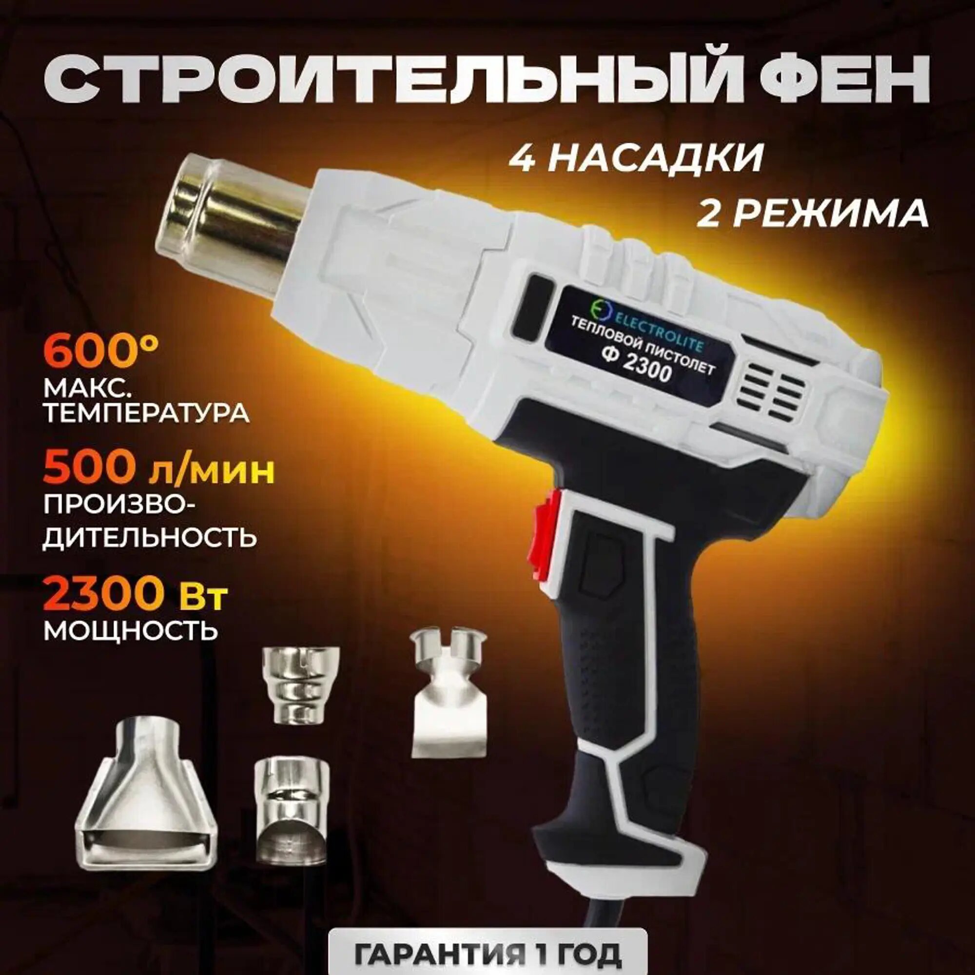 Фен строительный / Фен строительный с регулировкой температуры / Фен для термоусадки / ELECTROLITE Ф2300EL ( 2300 Вт, 220 В, 400/600 С, 300/500 л/мин, обрезиненная рукоять )