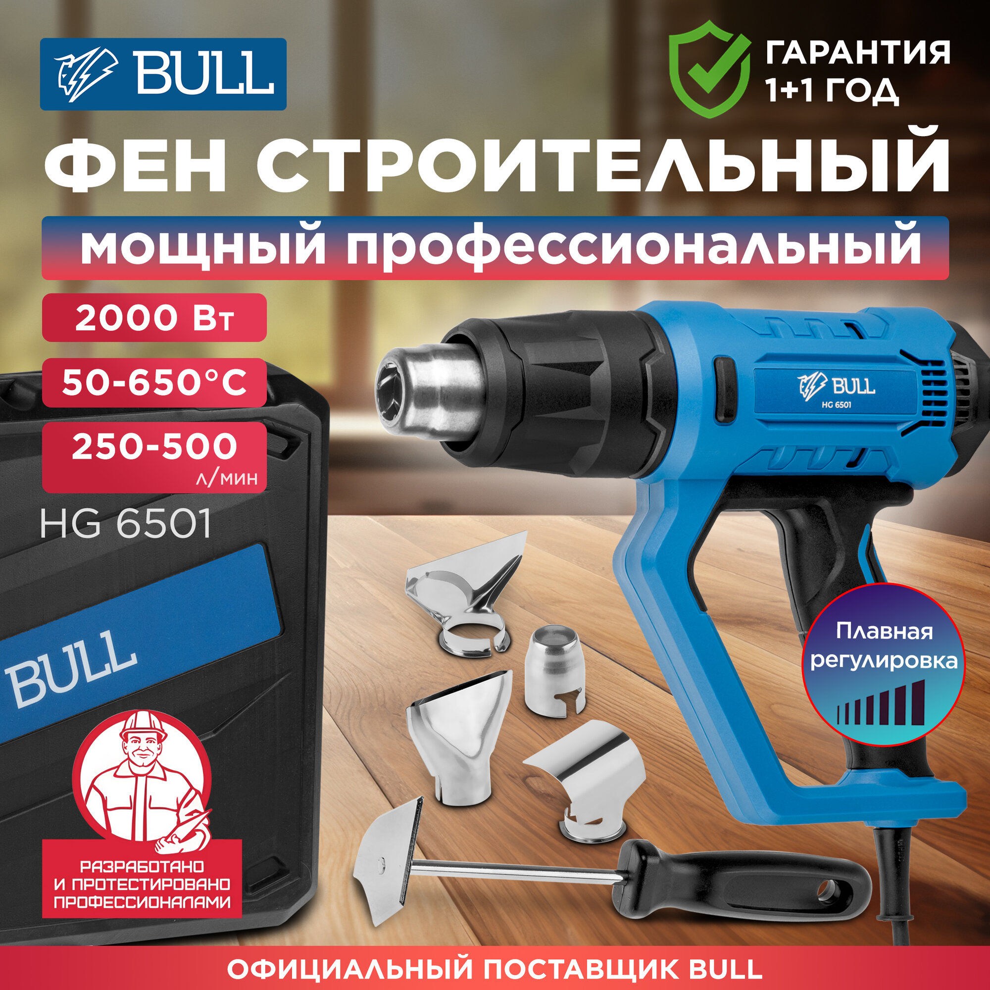 Термовоздуходувка BULL HG 6501 в чем. + набор сопл (2000 Вт, 50-650 °С, плавная регулировка, LCD-дисплей) (0326218)