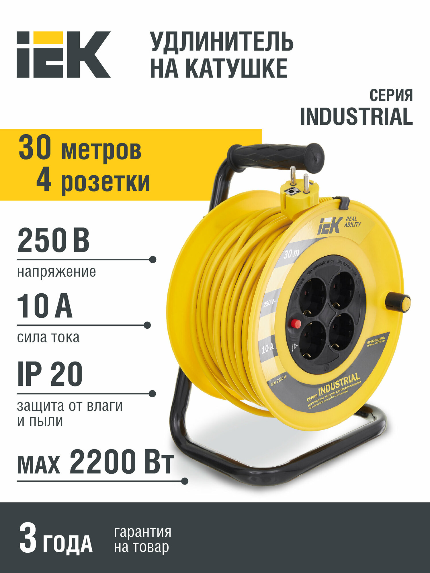 Удлинитель на катушке IEK Industrial УК30, 4 розетки, с т/з, с заземлением, 3 x 1 мм², 30 м