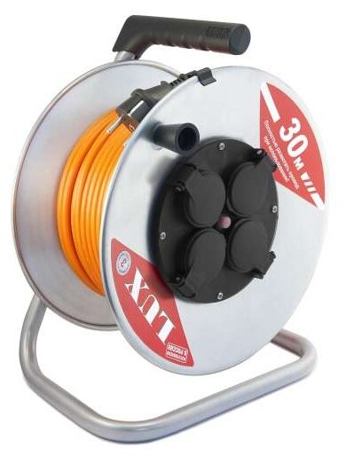 Силовой удлинитель LUX на металлической катушке К4-Е-30 ПВС 3x1.5 30 м 16 А 4 розетки с защитной крышкой IP44 50130 4606400420378