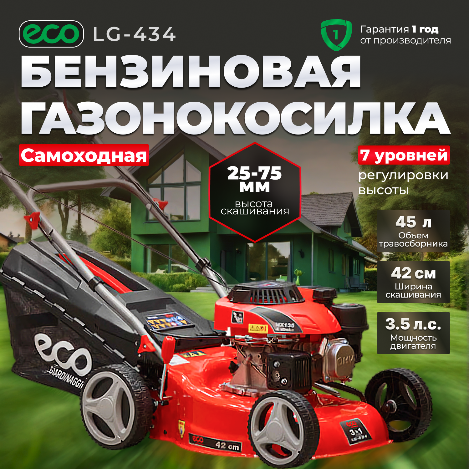 Газонокосилка бензиновая ECO LG-434 самоходная (3.5 л.с., ширина обработки 42 см, стальной корпус, травосборник 45 л) (LG-434)