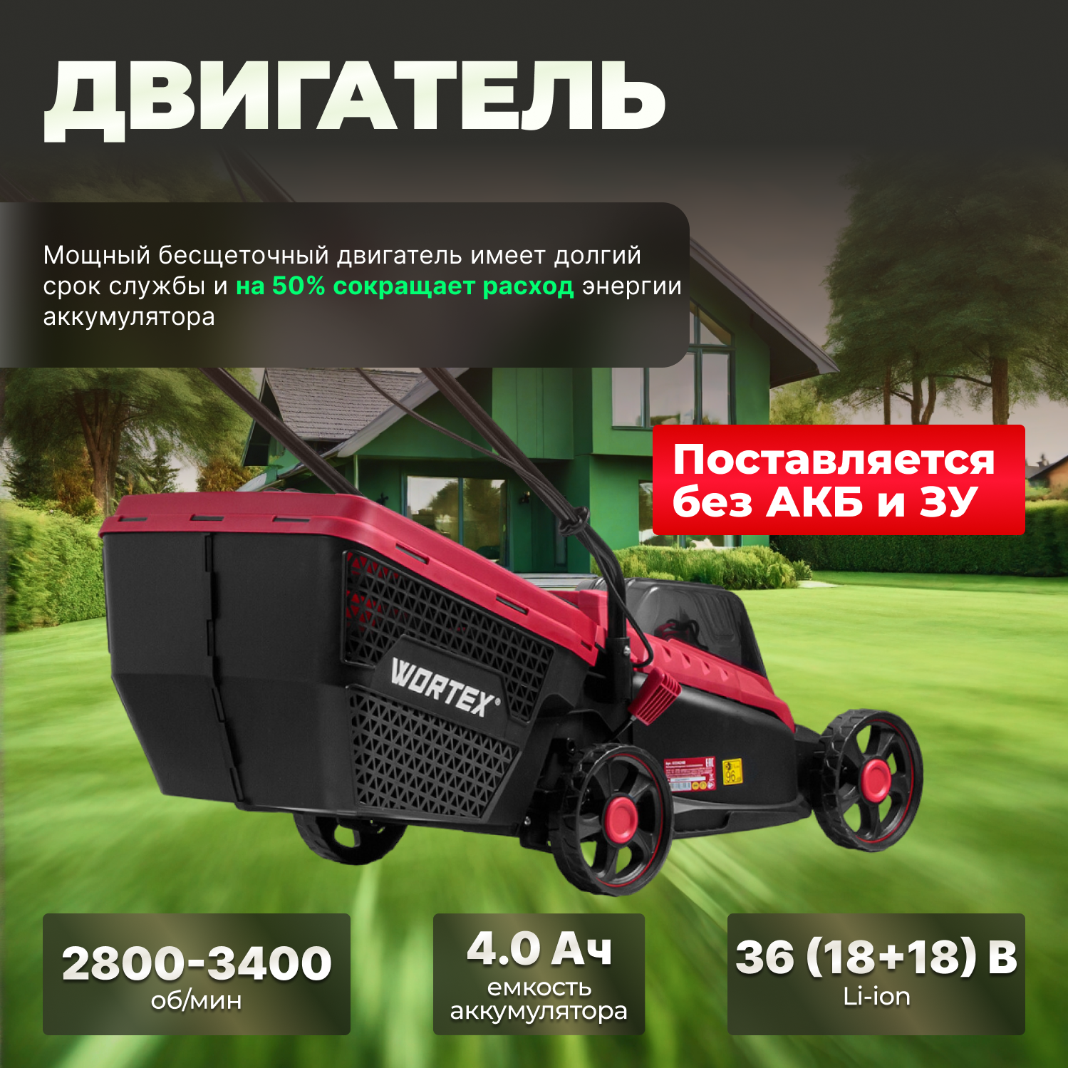 Газонокосилка аккумуляторная WORTEX CLM 3336 в кор. ALL1 SOLO бесщёт.двиг., 18В+18В, шир.330 мм (без АКБ И ЗУ, выс. 30-75 мм, травосборник 30 л) (0334 интересное:
