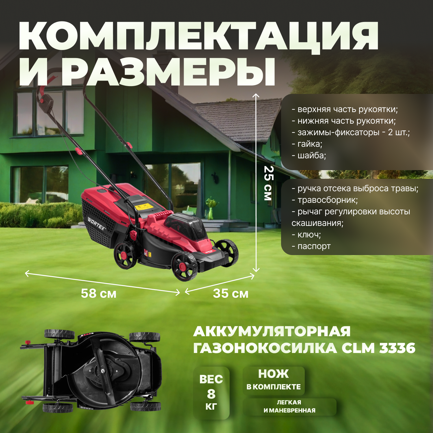 Ниже Вы можете прочитать отзывы на Газонокосилка аккумуляторная WORTEX CLM 3336 в кор. ALL1 SOLO бесщёт.двиг., 18В+18В, шир.330 мм (без АКБ И ЗУ, выс. 30-75 мм, травосборник 30 л) (0334, ознакомится с подробными характеристиками, посмотреть интересные обзоры и фотографии на Газонокосилка аккумуляторная WORTEX CLM 3336 в кор. ALL1 SOLO бесщёт.двиг., 18В+18В, шир.330 мм (без АКБ И ЗУ, выс. 30-75 мм, травосборник 30 л) (0334.