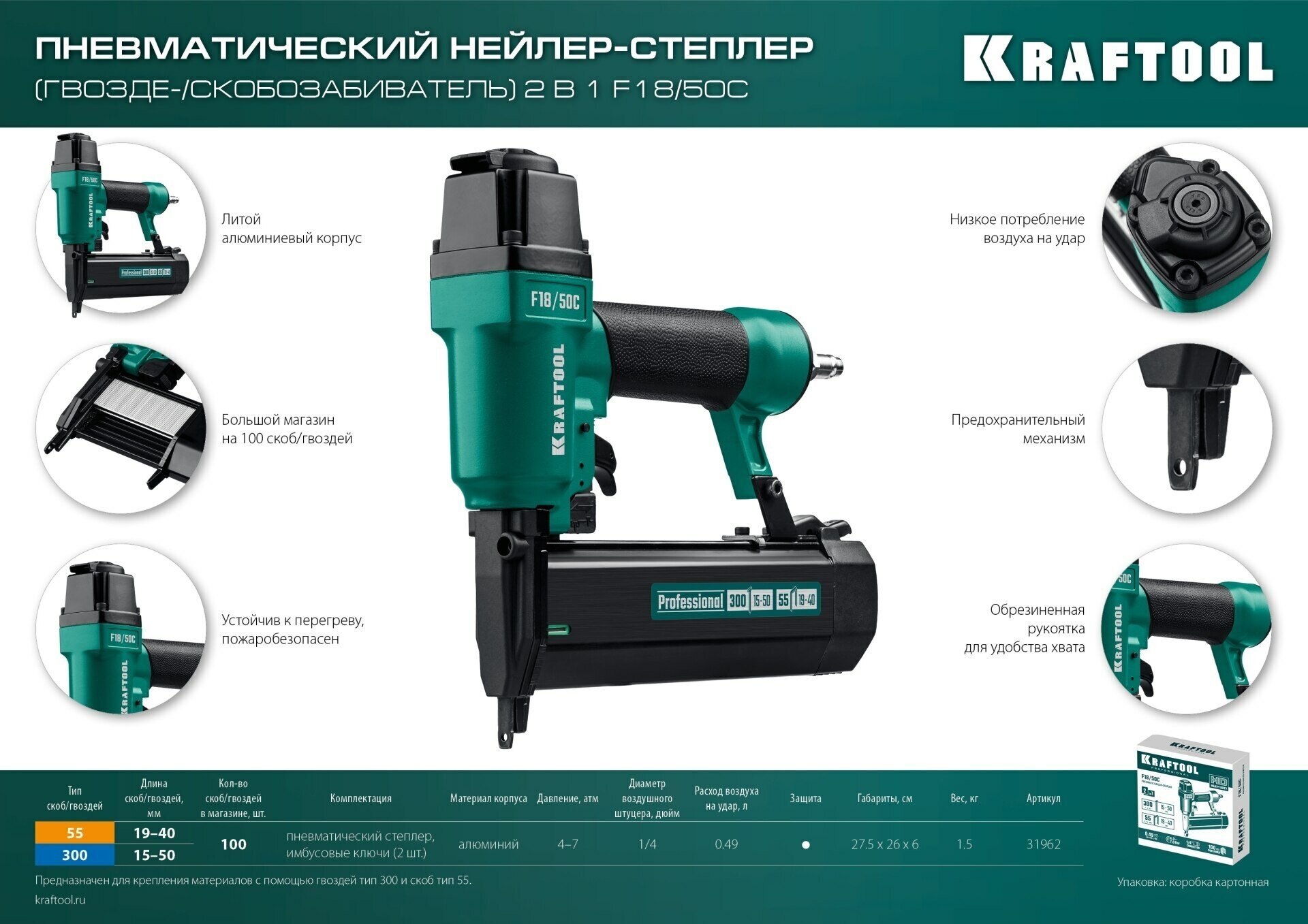 KRAFTOOL F18/50C, скобы тип 55 (19 - 40 мм) / 300 (15 - 50мм), пневматический нейлер-степлер (гвозде/скобозабиватель) 2-в-1 (31962)