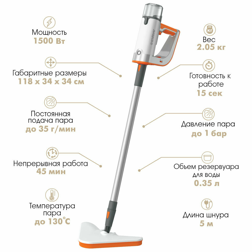 Паровая швабра ENDEVER Odyssey Q-621 white/orange (1500 Вт, объем резервуара 0,35 л, подача пара 35 г/мин) (90302)