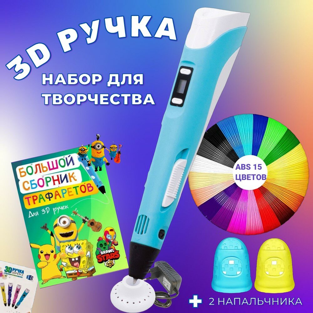 3D ручка с комплектом пластика ABS 150м + Книжка трафаретов +термостойкий коврик. Цвет голубой.