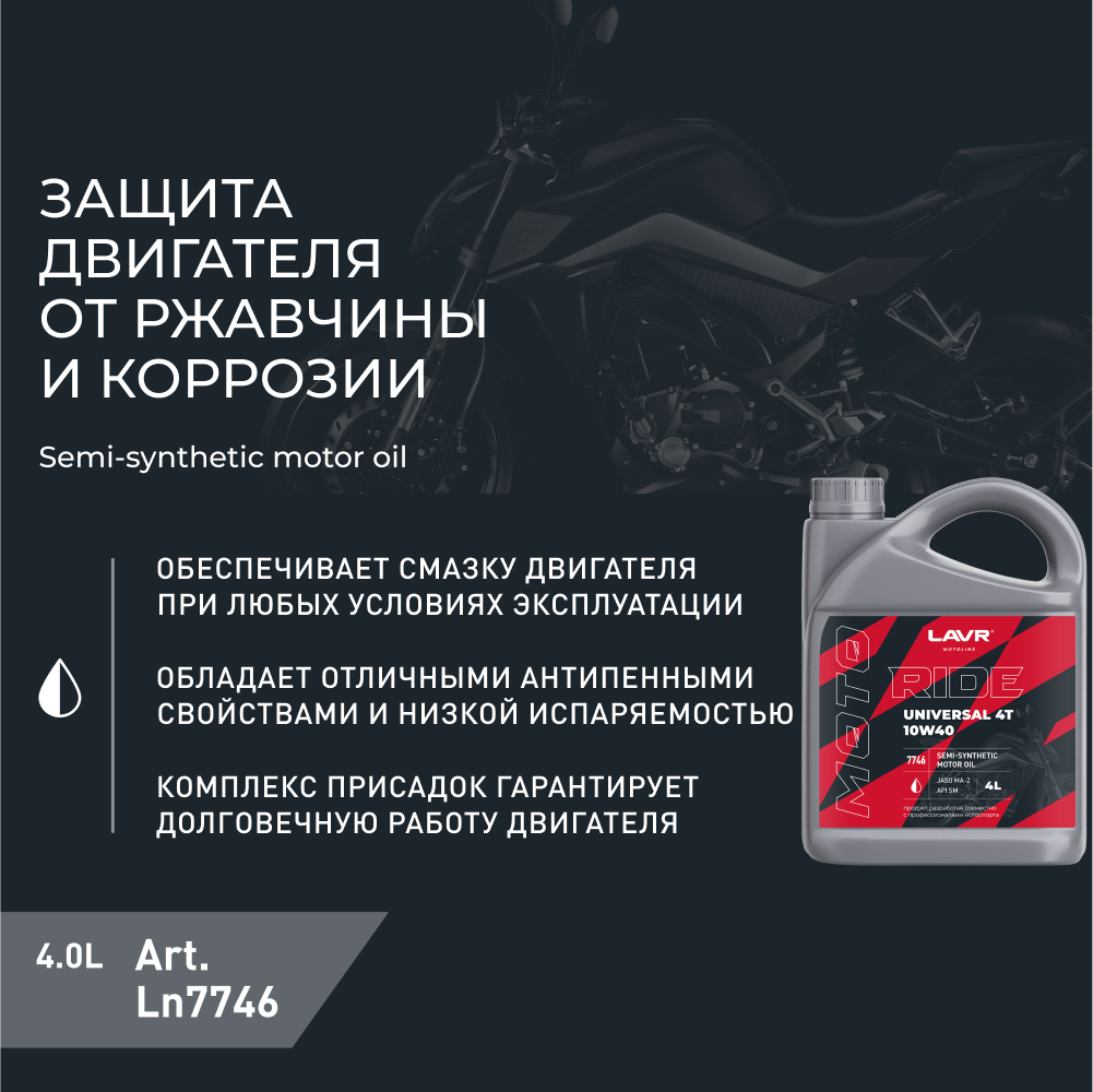 Масло Моторное Lavr 7746 Moto Ride Universal 4T 10W40 Sm 4Л П/Синт LAVR арт. LN7746