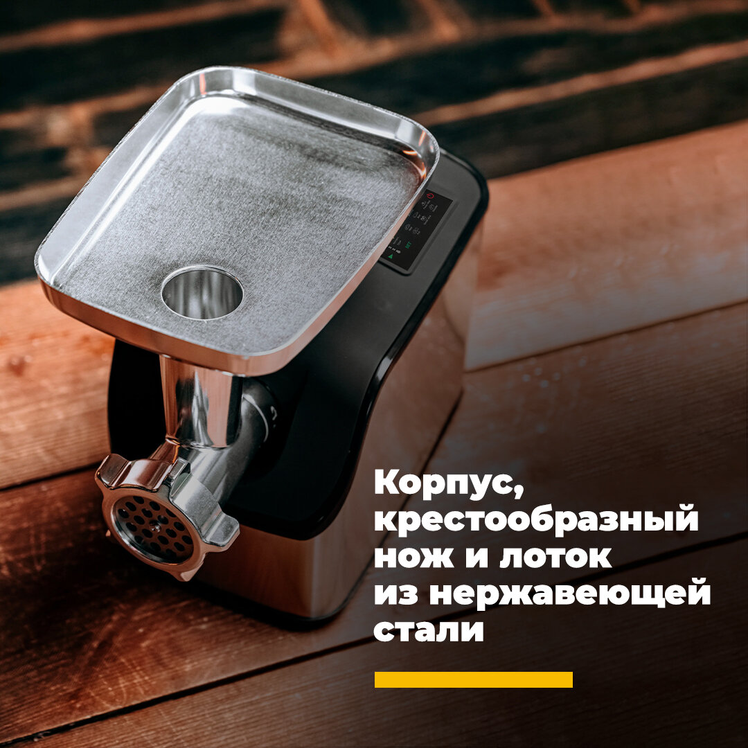 Мясорубка просто бомба, для меня самая быстрая и крутая, какую я только встречала. Сенсорная панель управления, есть функция контроль перегрева, а так же функция "Реверс". Разная скорость вращения на определенный вид продукта, всего 6 программ. Справилась с жилистой говядиной в считанные секунды. Никакого запаха пластика не имеет, даже когда непрерывно работает довольно долгий срок. Три вида решетки, крупная, средняя и мелкая, удобный поддон с широкими бортиками. Дополнительные насадки для колбасок. В комплекте имеется руководство по эксплуатации и там же рецепты для приготовления блюд. Вообщем я в восторге, крутая мясорубка, к покупке однозначно рекомендую.