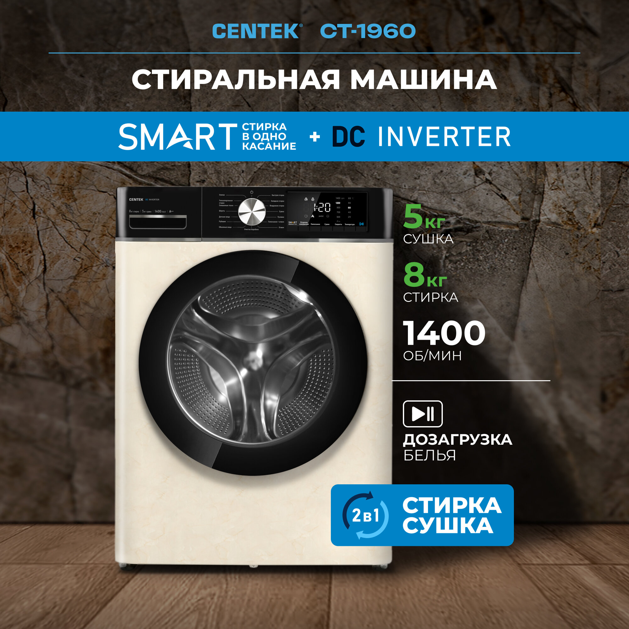 Купить Стиральная машина CENTEKCT-1960 бежевая, 8кг, INVERTER, сушка 5кг