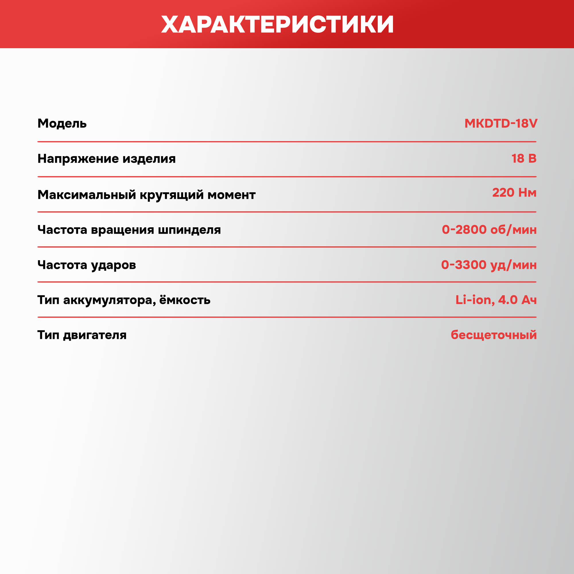 Аккумуляторный бесщеточный ударный винтоверт 18В, MKDTD-18V, 2 аккумулятора* 4 А*ч E0082 заказная