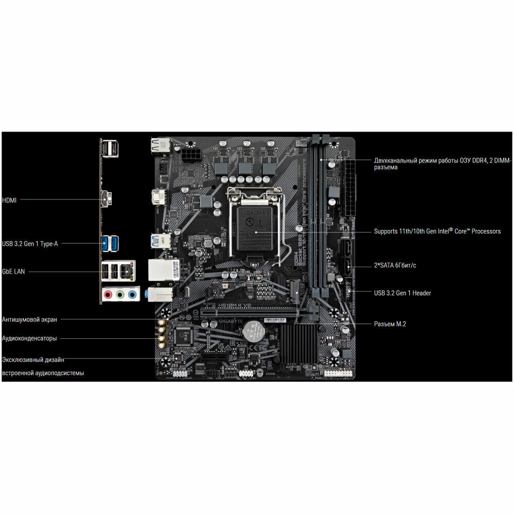 GIGABYTE H510M K V2, LGA1200, H470, 2*DDR4, HDMI, 2 SATA 6 Гб/с, M2, Audio, Gb LAN, USB 3.2, USB 2.0,COM*1 header, mATX