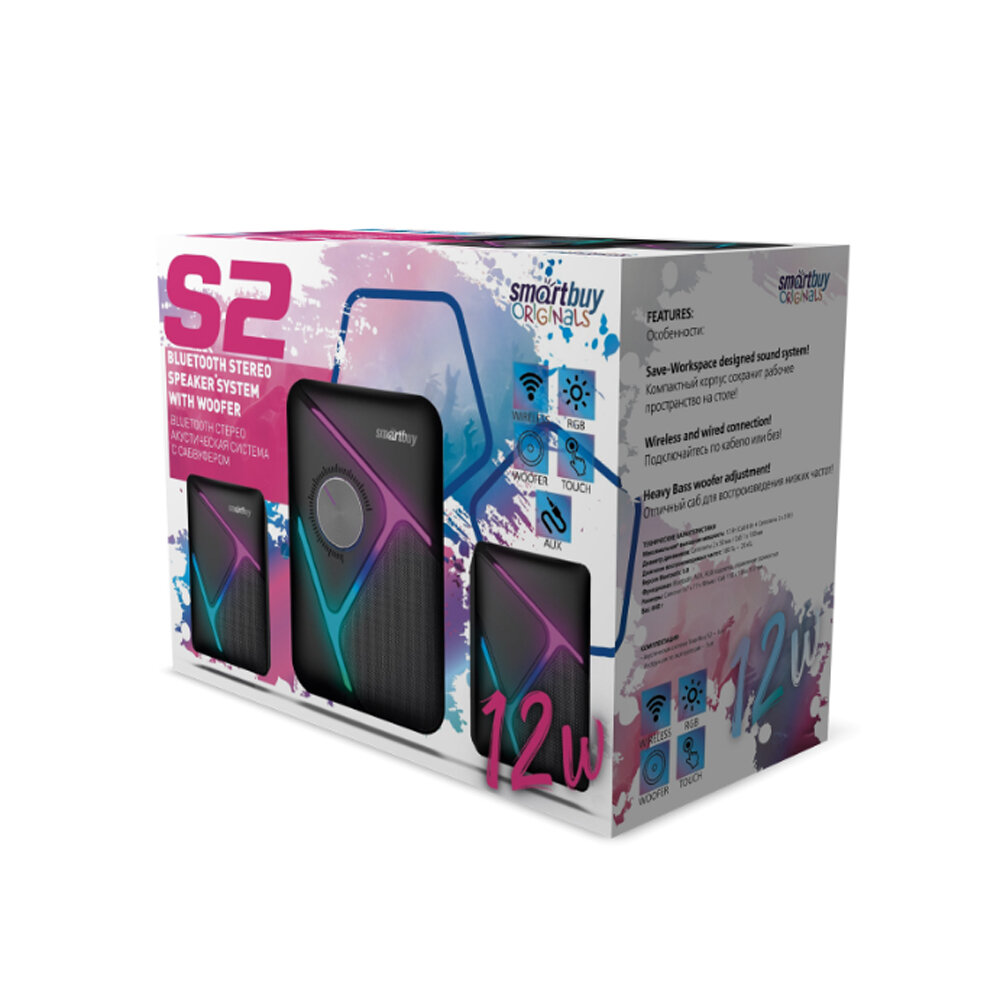Акустическая система 2.1 колонки Smartbuy S2, 12Вт, Bluetooth, LED-подсветка (SBA-4500)
