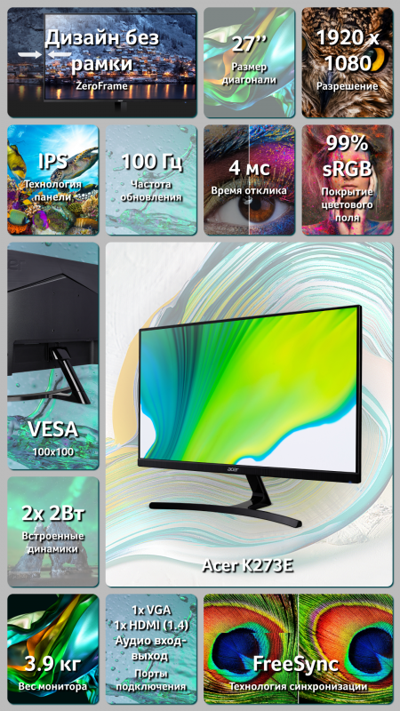 Монитор Acer 27'' ACER K273Ebmix IPS, 1920x1080, 4ms, 250cd, 100Hz, 1xVGA + 1xHDMI(1.4) + Audio In/Out, Speakers 2Wx2, FreeSync