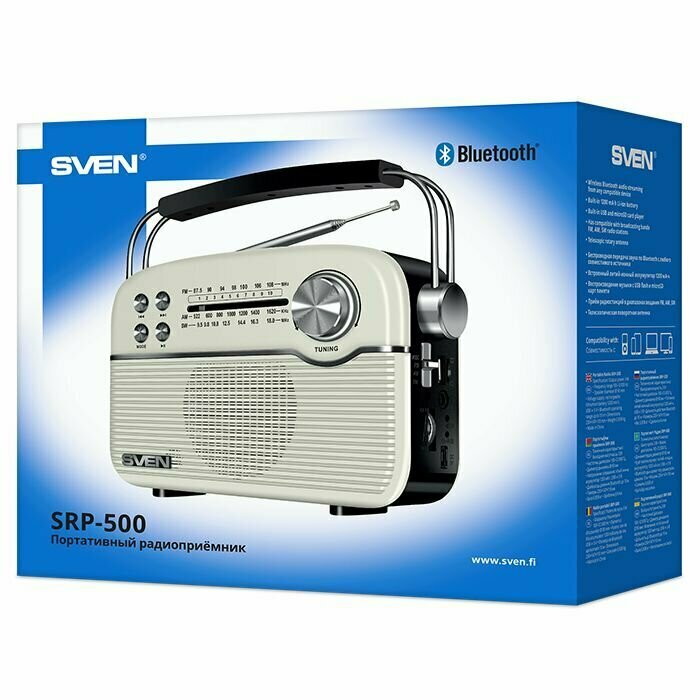 Радиоприёмник SVEN АС SRP-500 белый, 3 Вт, Bluetooth, FM/AM/SW, USB, microSD, AUX, встроенный аккумулятор SV-020422