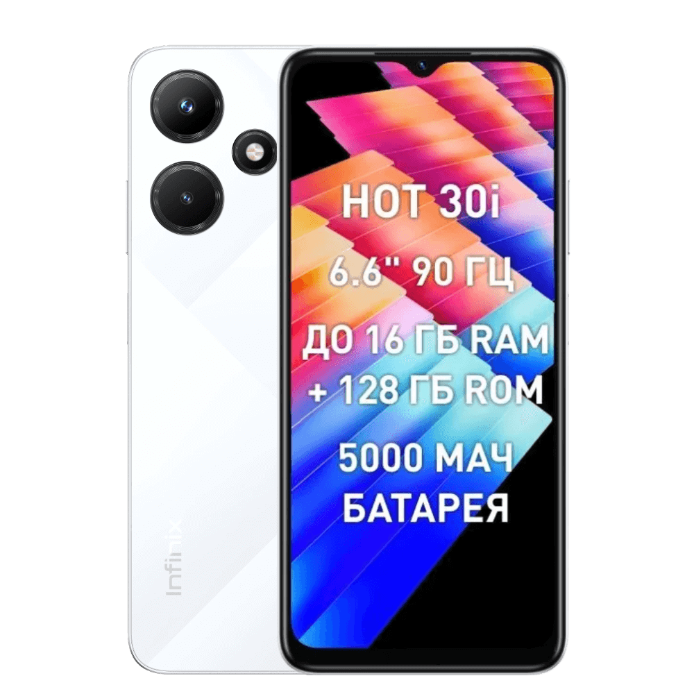 6,56" Смартфон Infinix Hot 30i 128 ГБ (HOT 30I) белый - 8 х 1,6 ГГц, 4 ГБ, 2 Nano-SIM, IPS, 1612x720, 13 Мп, 3G, 4G (LTE), 5000 мА*ч