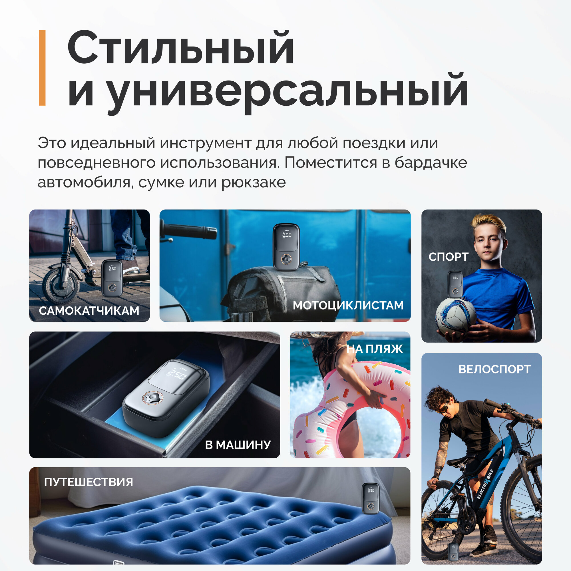 2) Шланг просто и надежно монтируется/демонтируется к насосу и к колесам 3) Легко меняются насадки 4) Поддерживает разные настройки для велосипеда, мото, авто, мячей 5) Компактный (с легкостью помещается во взрослую мужскую руку) 6) Аккумулятор заряжается быстро, расход пока согласно заявленному описанию 7) Есть встроенный фонарик (может быть полезно тем, кто любит поездки в темное время суток) 8) Легко и быстро настраивается нужный уровень давления, насос сам останавливается по достижению выставленного уровня. 9) Может выполнять функцию power-bank-а (в короткие путешествия можно не брать зарядники/другие powerbank-и, а питаться от насоса) |