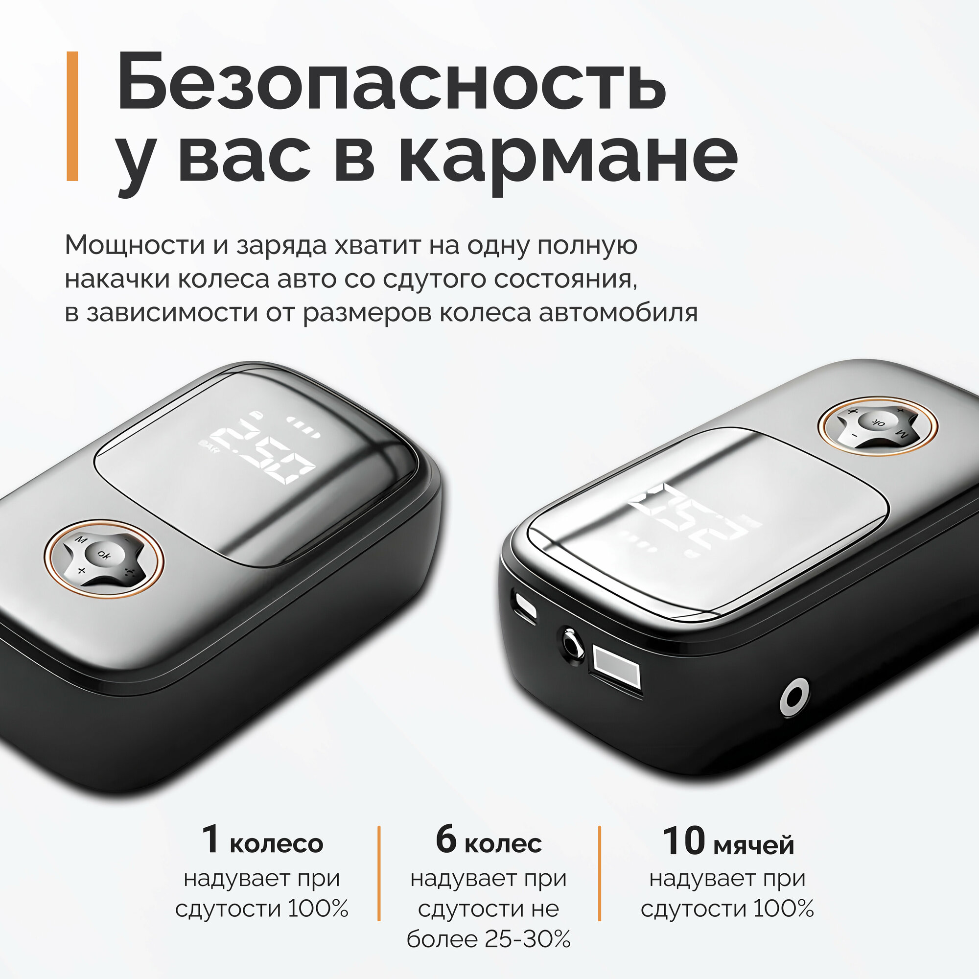 | Минусы: | Недостатки есть но один при накачки колёс нехвотоет заряда но я качал колёса на машине а на велосипедные колёса хватает насос как повербанк можно использовать но заредит только до 25% в принципе всё нормально |