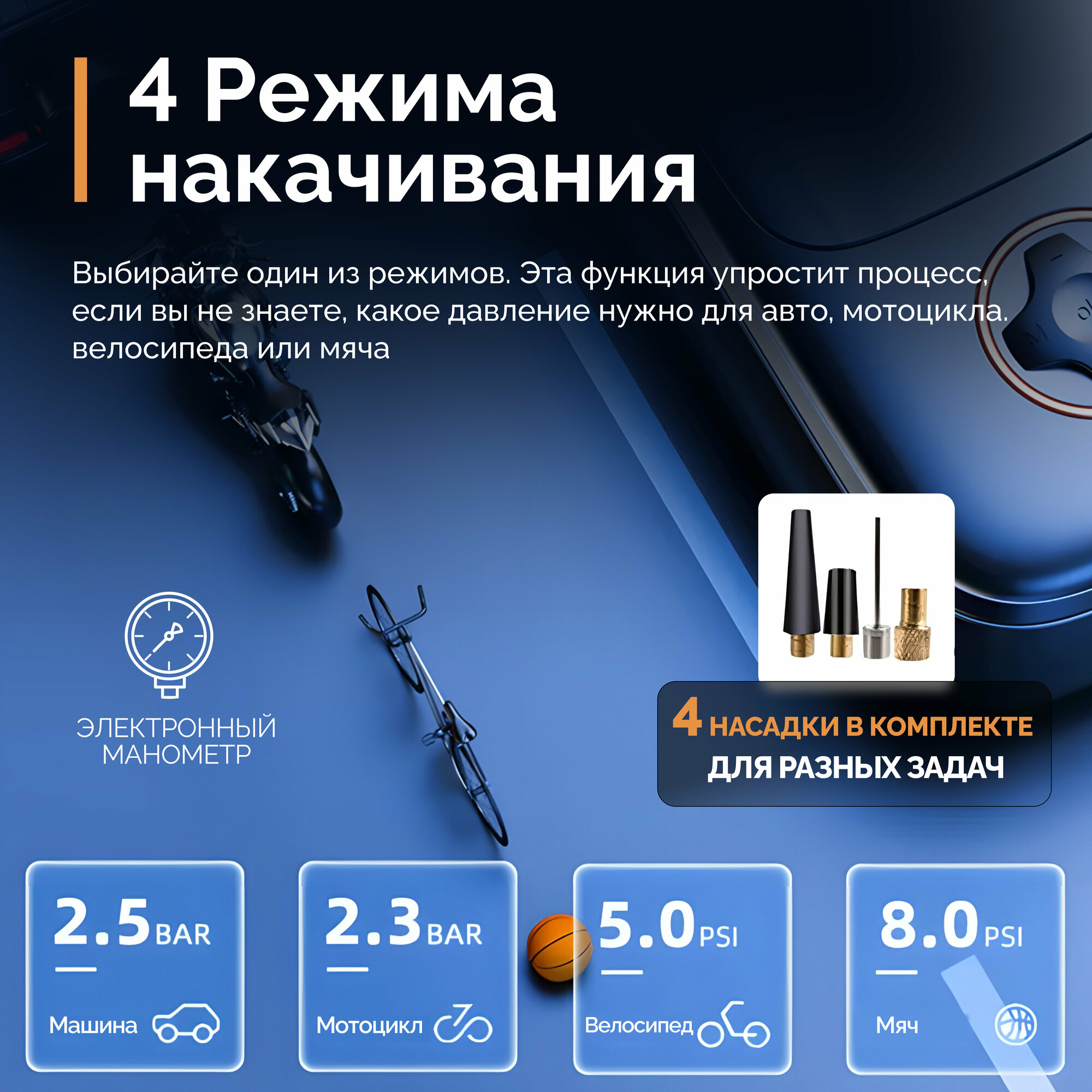 | Особенности | крепление к велосипеду / манометр / набор / умный насос |