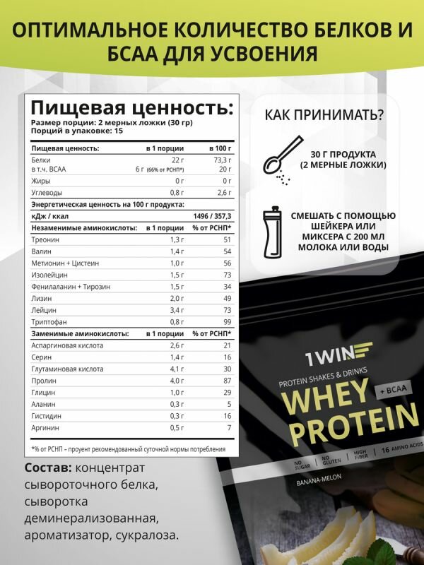 Сохранить1WIN Протеин Whey Protein, Сывороточный белковый коктейль для похудения, без сахара, Банан-Дыня, 450 г. интересное: